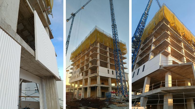 El edificio ya ha alcanzado la séptima planta, sobre un total de una veintena. Se avanza rápido por lo que en apenas unas semanas se llegará ya a la mitad de la altura final del inmueble. Pero, a la vez, se está trabajando en el cerramiento de las primeras plantas, sin utilizar los tradicionales ladrillos. Así, la empresa sevillana ha apostado en esta ocasión (este es el tercer edificio que ejecuta en Cádiz capital) por la construcción industrial, inaugurando en la ciudad este modelo de realización de las obras. Este proceso permite agilizar los trabajos.