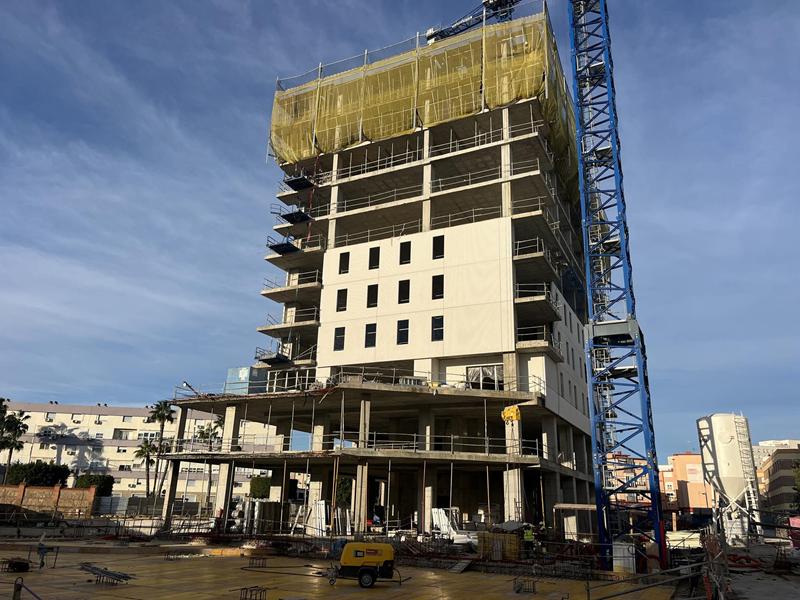 Tal y como se aprecia en las imágenes que nos hace llegar el departamento técnico de ABU, la torre ya cuenta con más de diez plantas, noticia de la que se ha hecho eco el Diario de Cádiz y, simultáneamente, se están completando las fachadas del edificio. En esta fase del proyecto, podemos compartir que se ha completado el 50% de la estructura y además han comenzado los trabajos de tabiquería e instalaciones, albañilería y los revestimientos.