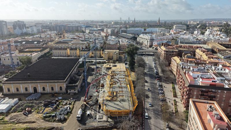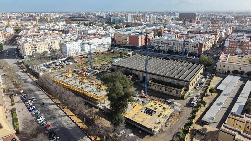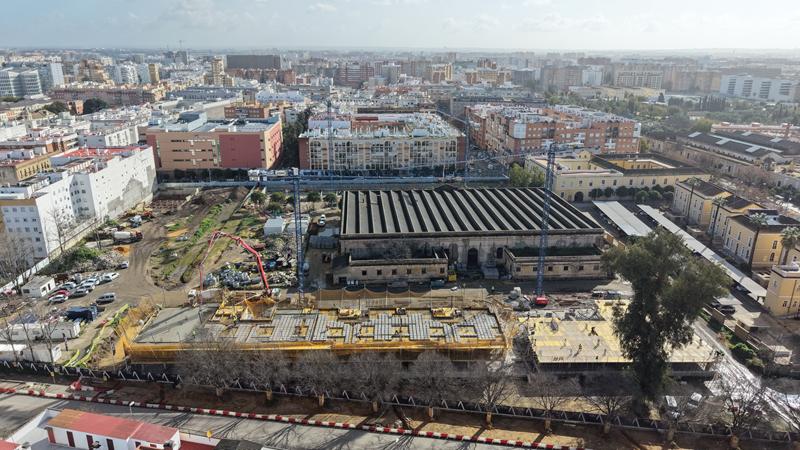 Residencial Artillería, el complejo de viviendas de obra nueva que generará un nuevo barrio y que transformará el entorno de las naves de Santa Bárbara, continúa avanzando a buen ritmo. Las últimas imágenes aéreas muestran el progreso de las obras de la primera fase del proyecto, que linda con José María Moreno Galván. Este complejo es el buque insignia de Grupo ABU en Sevilla y convertirá este enclave industrial, junto al barrio de San Bernardo, en un exclusivo complejo residencial compuesto en total por 141 viviendas.