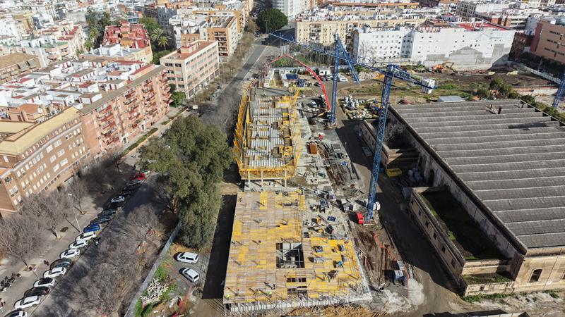 La estructura del primer edificio de 72 viviendas, que se levanta ya en la parcela de las antiguas Naves de Santa Bárbara, avanza como se aprecia en las imágenes de dron.
