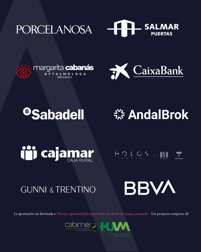 Queremos expresar nuestro más sincero agradecimiento a todas las empresas y personas que, desde el primer momento, han decidido sumar su apoyo a esta causa solidaria. Su aportación económica es fundamental para hacer realidad esta noche tan especial, cuyo objetivo es recaudar fondos a favor de la investigación contra el cáncer de mama metastástico.
