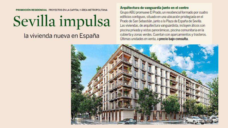 Grupo ABU promueve El Prado, un residencial formado por cuatro edificios contiguos, situado en una ubicación privilegiada en el Prado de San Sebastián, junto a la Plaza de España de Sevilla. Las viviendas, de arquitectura vanguardista, incluyen áticos con piscina privada y vistas panorámicas, piscina comunitaria en la cubierta y zonas verdes. Cuentan con aparcamientos y trasteros.